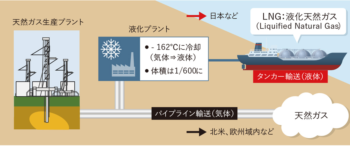 また「気体」から「液体」に形を変えると、同じ量でも「気体」に比べ体積が1/600まで凝縮されるので一度にたくさんの量をタンカーに積んで運ぶことができ、かつ貯蔵することができるのです。