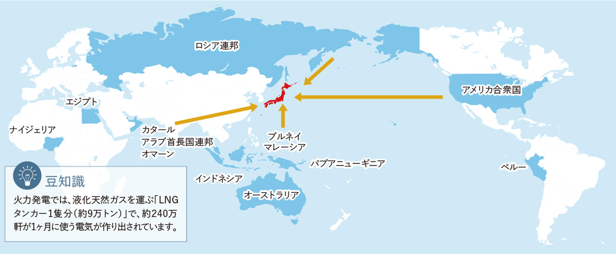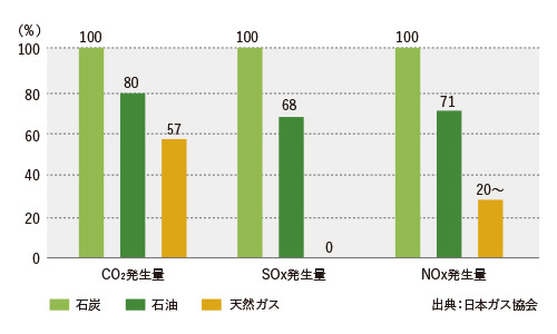 「気体」である天然ガスをマイナス162℃まで冷却すると「液体」になります。その液化した天然ガスの英語表記「Liquified Natural Gas」の頭文字をとって「LNG」といいます。天然ガスは、石油や石炭と同じ化石燃料ですが、燃やしたときに出る二酸化炭素(CO2)などの量が、石炭や石油よりも少ないことから「地球にやさしいエネルギー」と言われています。