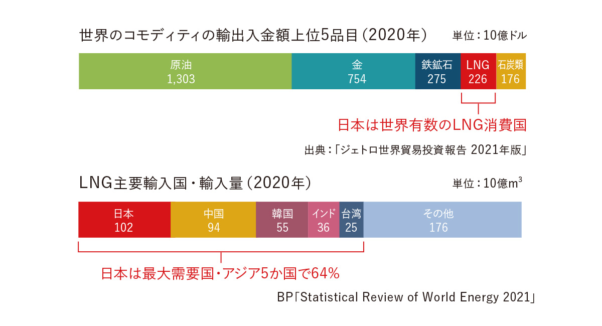 LNGは、国際貿易において世界上位5品目の中に位置し、原油、金、鉄鉱石に次ぐ市場規模を誇るコモディティです。また、日本が属する北東アジアは世界有数のLNG消費地域であり、総輸入量は世界全体の大部分を占めています。