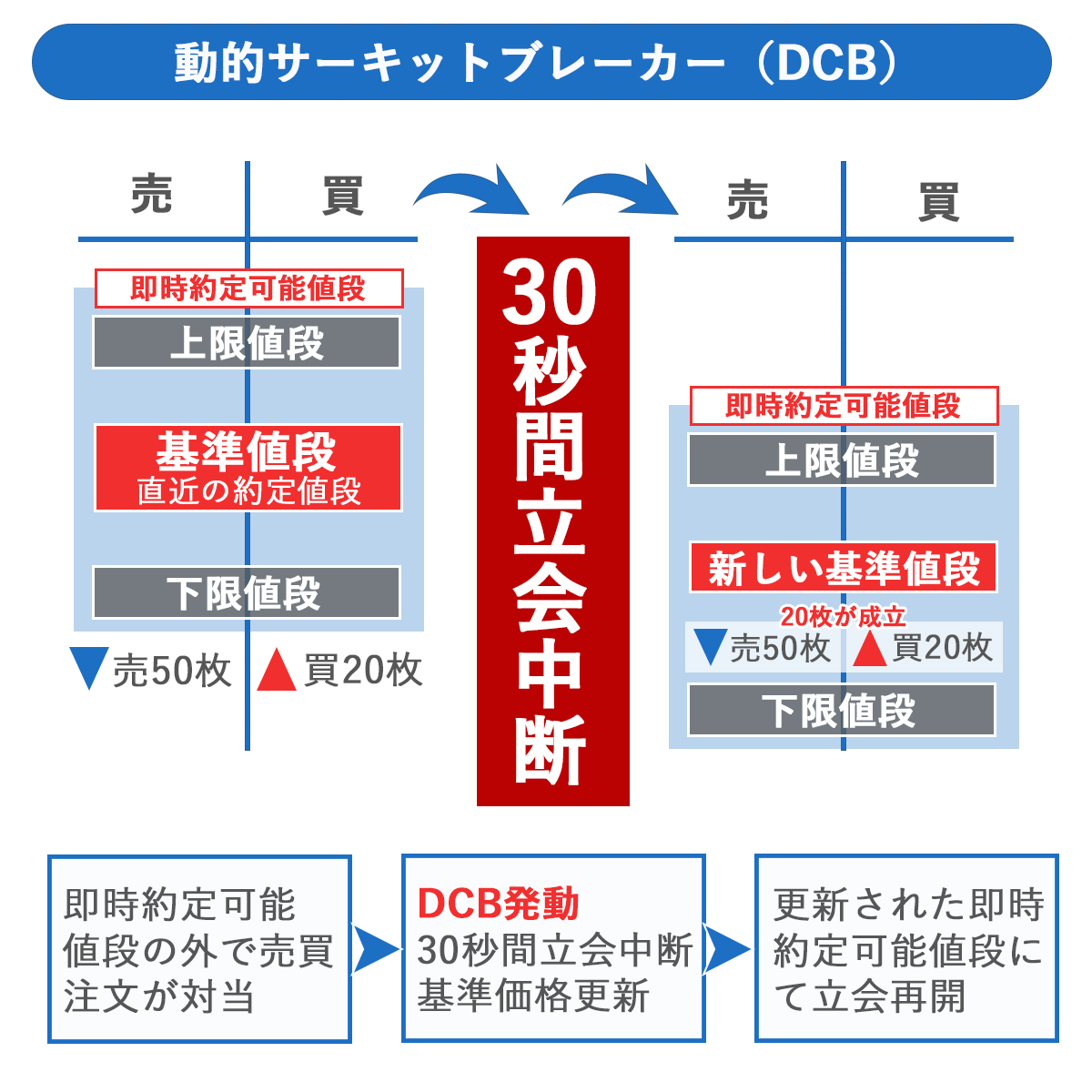 値幅の上限値段と下限値段を決定する起点となる値段に刻々と変動する直近の約定値段を用いるため値幅も刻々と変動することから動的サーキットブレーカーと呼ばれます。英語表記であるDynamic Circuit Breakerの頭文字をとって「DCB」と呼ばれることもあります。