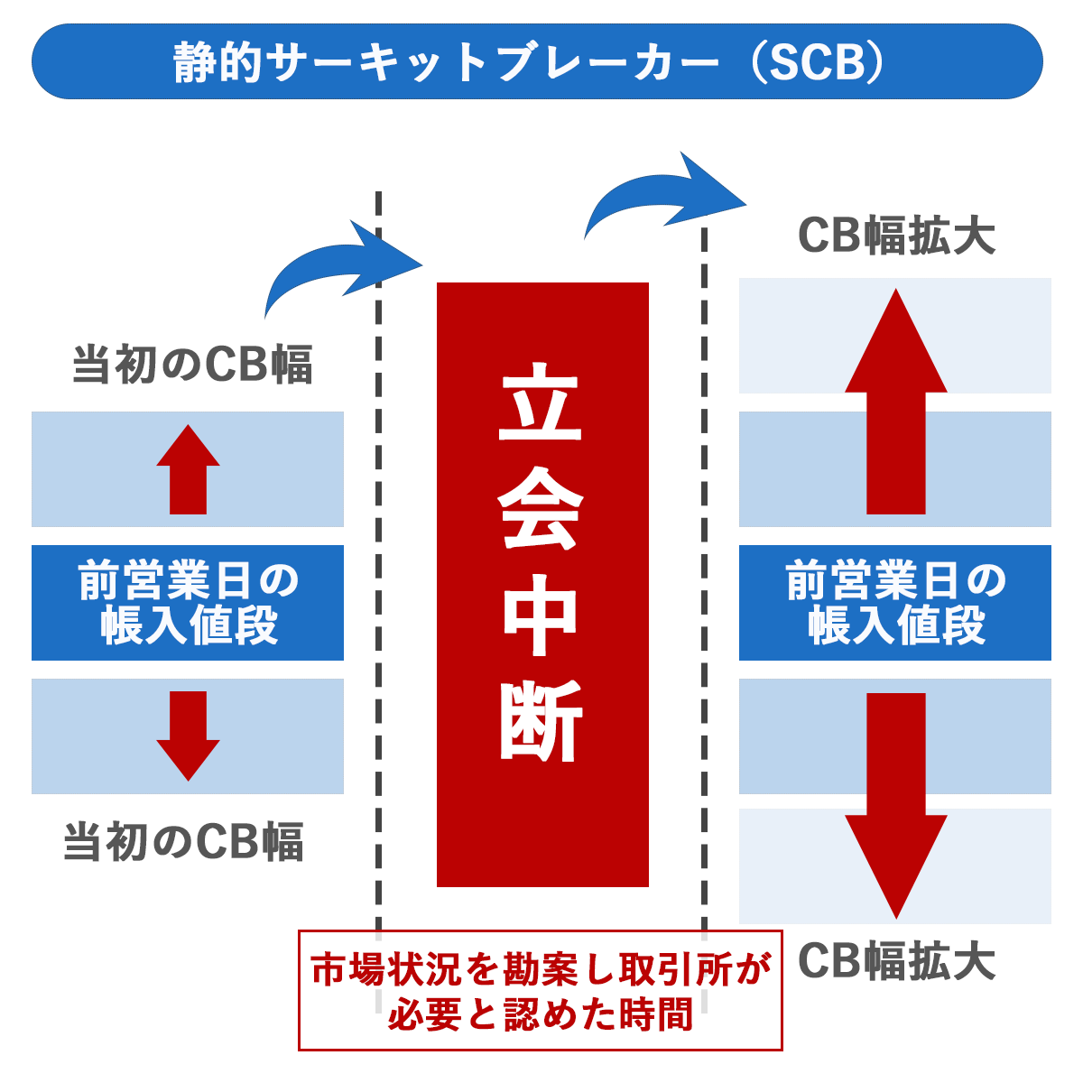 値幅を設定するための起点となる価格は一貫して前日の帳入値段であり、同一営業日内では変化しないため、「静的サーキットブレーカー」と呼ばれます。単にサーキットブレーカーと呼ばれる場合や、英語義表記であるStatic Circuit Breakerの頭文字をとって「SCB」と呼ばれる場合もあります。