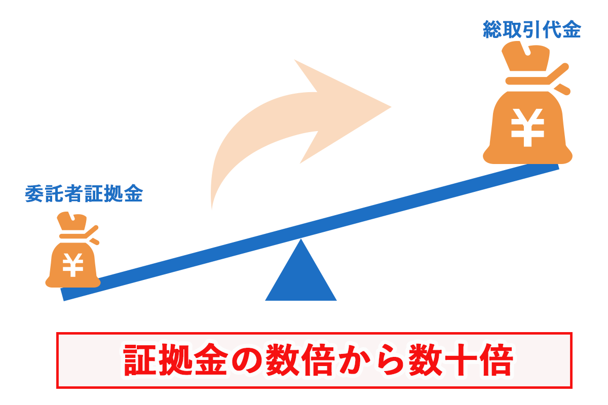 取引代金の受け渡しを行わない差金決済取引では、取引の担保となる証拠金を預託することで取引に参加することができます。取引代金と比較して少額の証拠金で取引が始められるため、証拠金の何倍もの取引を行うことができます。大きな利益を生むチャンスがある一方、損失も同様に大きくなるリスクがあることには注意が必要です。