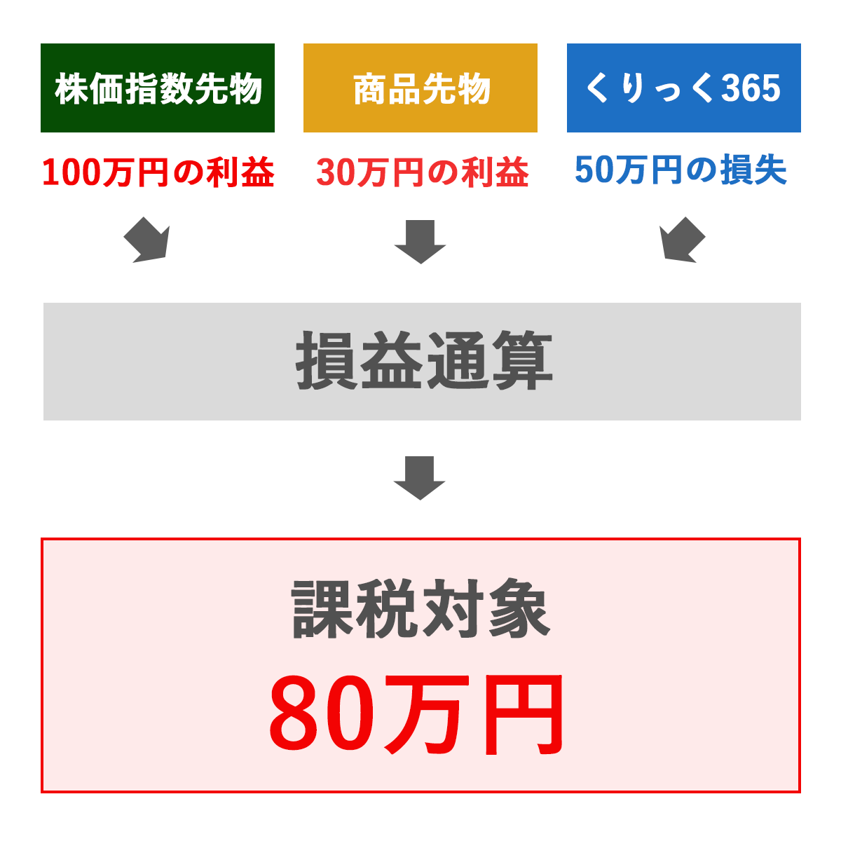 例:株価指数先物取引で100万円の利益、商品先物で30万円の利益、くりっく365で50万円の損失の場合、差し引きで80万円が課税対象額となります。