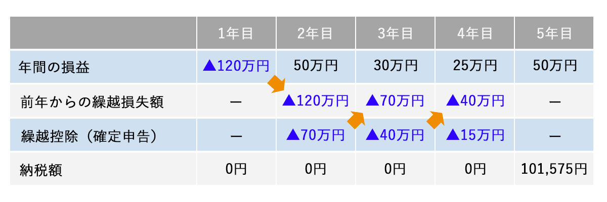 - ※ 3年を超えて損失を繰り越すことは不可能です。上記の例では5年目に損失を繰り越すことができないため、101,575円(50万円×20.315%)の納税が必要となります。