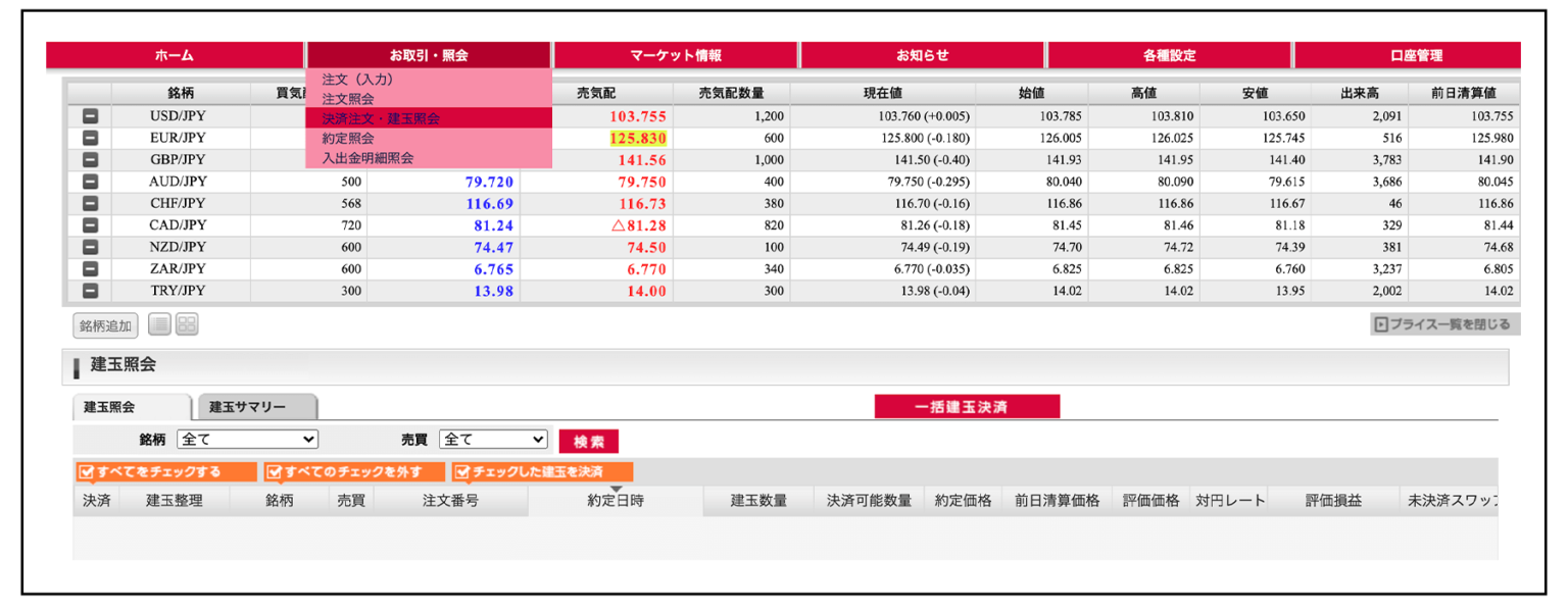 決済注文が発注されていない全ての建玉を一括で決済する注文方法です。なお決済対象の建玉のうち、両建てとなっている建玉に関しては建玉整理で決済され、それ以外は成行注文で決済されます。