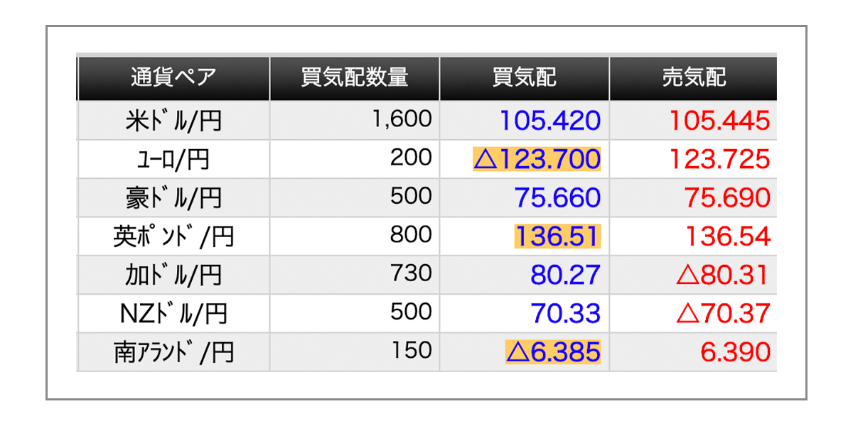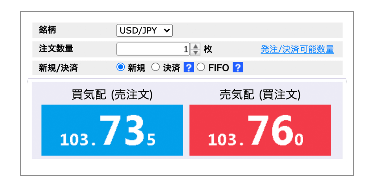 取引画面上に売り買い両方のレートが表示され、そのいずれかの価格部分を直接クリックして発注する注文方法です。実勢に近い水準での約定が期待されますが、注文が失効されることもあります。
