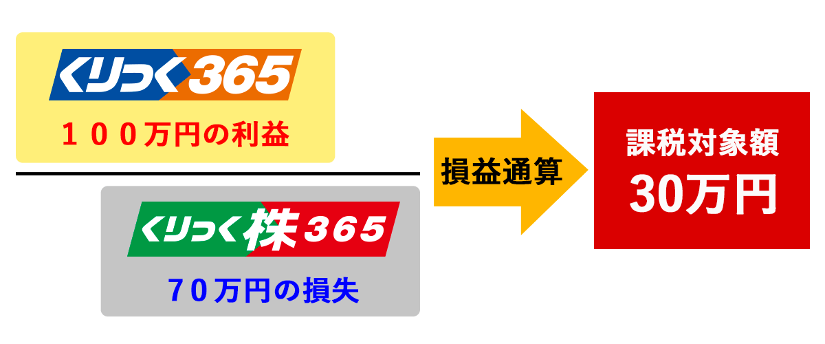 例:くりっく365で100万円の利益を得、くりっく株365で70万円の損失が出た場合、差し引き30万円が課税対象金額となります。