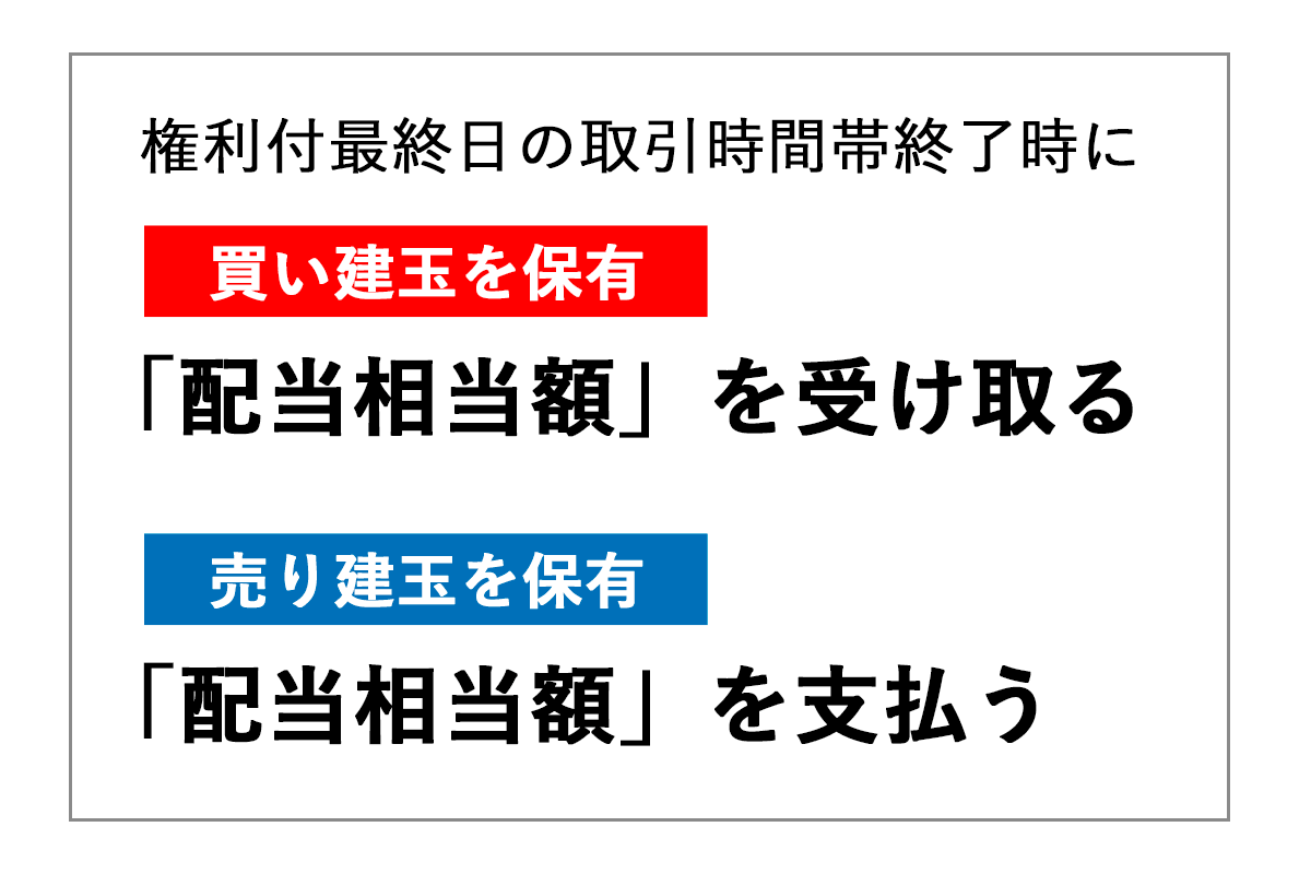 権利付最終日と同じ取引日の取引時間帯終了時に買い建玉を持っている場合は「配当相当額」分の受け取りが発生し、売り建玉を持っている場合は「配当相当額」分の支払いが発生します。