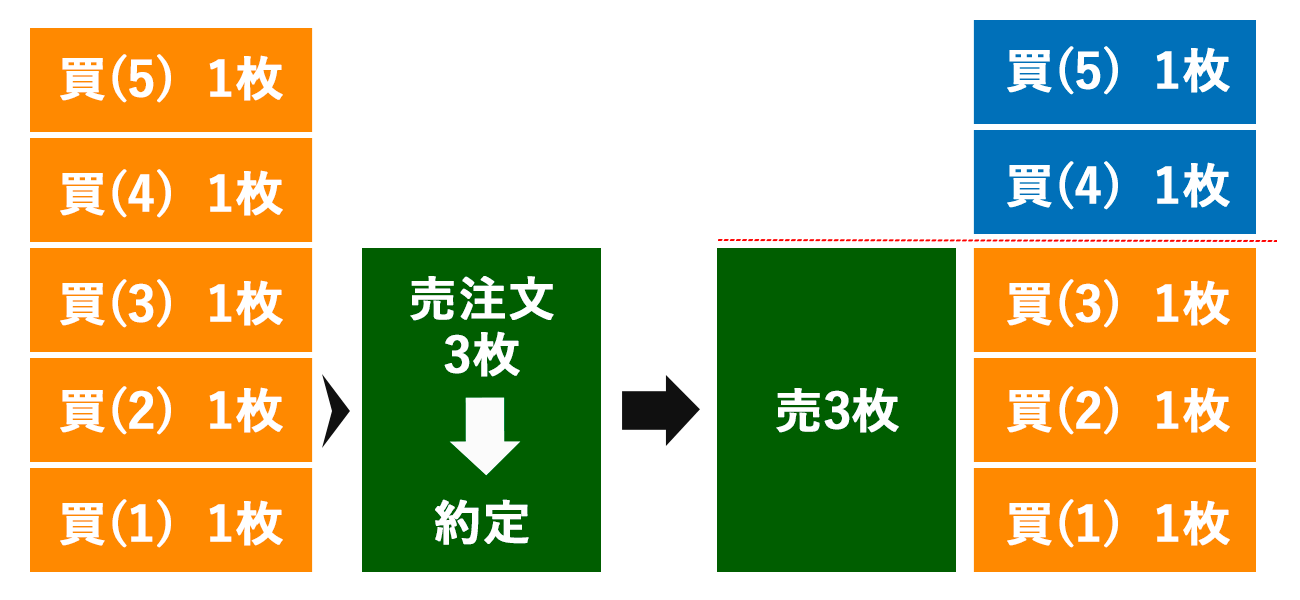 例:ある銘柄・リセット日が同一の取引で、先に成立している各1枚の買い建玉(1)~(5)がある状態で、新たに売り注文3枚を約定した場合、転売の申告を行わずに(買い建玉(1)~(5)のいずれとも決済せずに)、新たに3枚の売り建玉を保有した例です。
