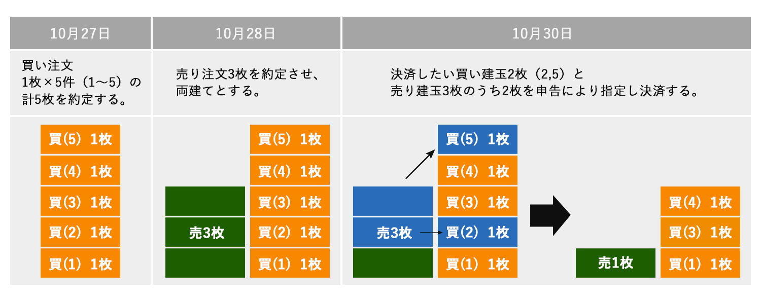 例:10月27日にある銘柄・リセット日が同一の取引で、各1枚の買い注文(1)~(5)を約定させました。翌28日に新たに売り注文3枚を約定させて両建てとしました。10月30日に、買い建玉(2)、(5)と売り建玉のうち2枚を指定して「転売・買戻しの申告(建玉整理)」を行い、その結果、買い建玉 (1)、(3)、(4)と売り建玉の残り1枚を両建てとして引続き保有した例です。