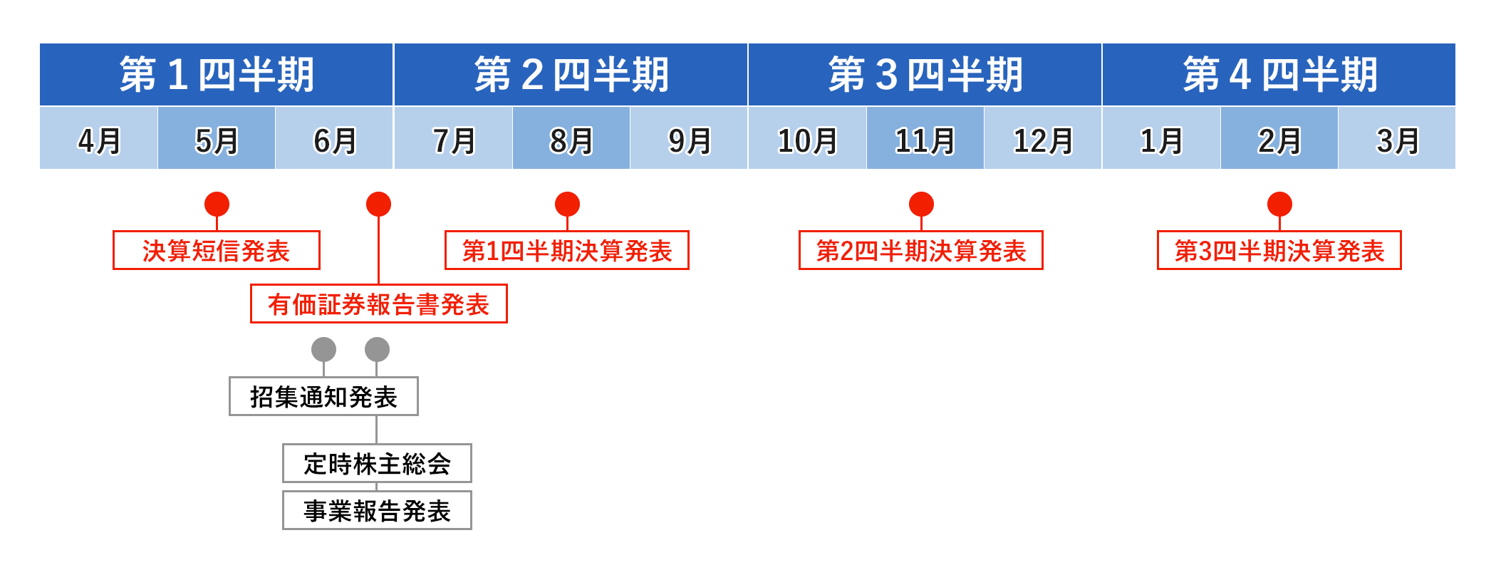 | 2024年06月 | 招集通知発表 (予定) 有価証券報告書発表 (予定) 事業報告発表 (予定) 定時株主総会 (予定) |