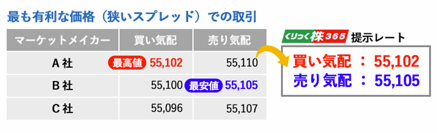 「くりっく株365」は、複数のマーケットメイカーから提示された取引価格の中から、マーケットメイカーにとって最も安い売却価格(売り気配)と最も高い買い取り価格(買い気配)を自動的に抽出して、投資家に提示しています(投資家の買い注文は売り気配で、売り注文は買い気配でそれぞれ約定します)。